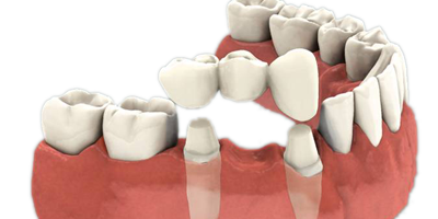 Bridges are commonly used to replace one or more missing teeth. They span the space where teeth are missing. Bridges are cemented to the natural teeth or implants surrounding the empty space. These teeth, called abutments serve as anchors for the bridge. A replacement tooth called a pontic, is attached to the crowns that covers the abutments.